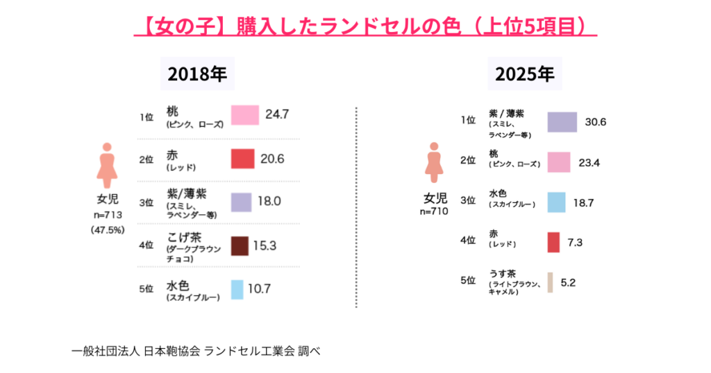 また、女の子の場合は2018年には購入者数2位にランクインした赤色(20.6%)ですが、2025年には7.3%にまで減少。「紫/薄紫」「ピンク」「水色」の上位3色が半数以上を占めるなど、個性豊かなカラーが主流になっています。つまり今は、「派手な色=少数派」ではなく、むしろ多数派の時代と言えるでしょう。